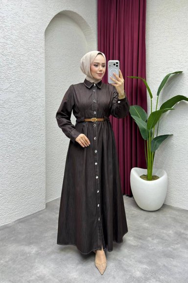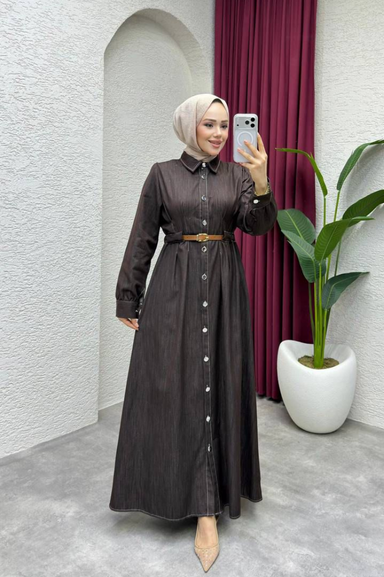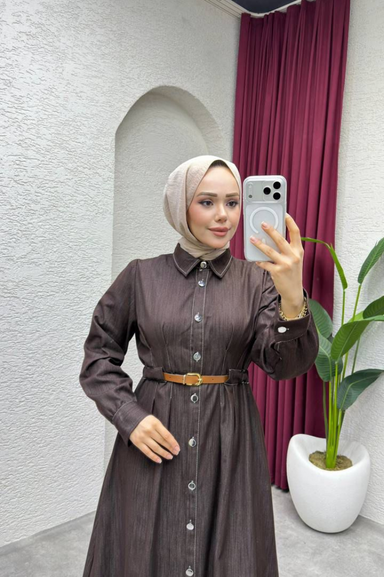 Weak Blue Kadın Kahverengi Elbise Uzun Düğmeli Kemer Detaylı Belden Oturan Tesettür Elbise Günlük Şık Kombin