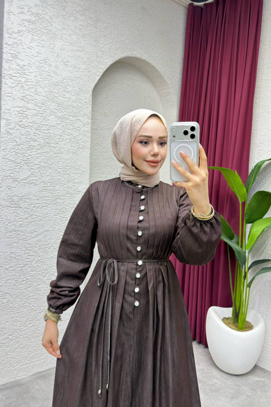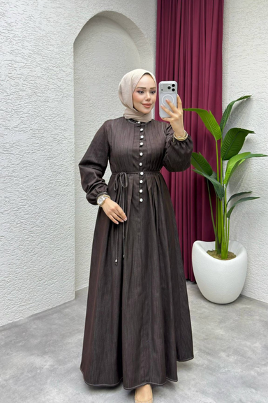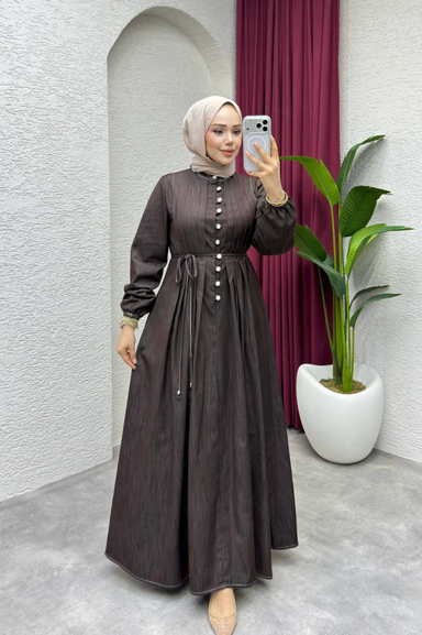 Weak Blue Kadın Kahverengi Elbise Uzun Düğmeli Belden Bağlama Detaylı Tesettür Elbise Rahat Kalıp Günlük Şık Kombin