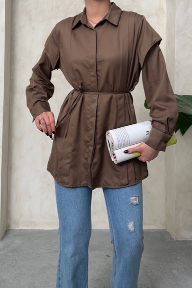 Weak Blue Kadın Kahverengi Tunik Gömlek Kemerli Uzun Kollu Tesettür Gömlek Rahat Kalıp Günlük Şık Kombin