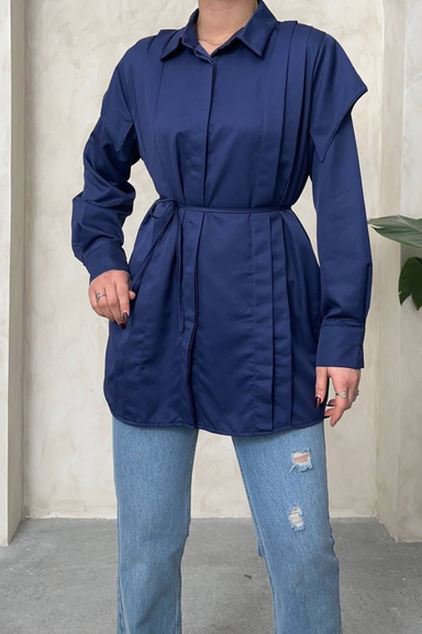 Weak Blue Kadın Lacivert Tunik Gömlek Kemerli Uzun Kollu Tesettür Gömlek Rahat Kalıp Günlük Şık Kombin