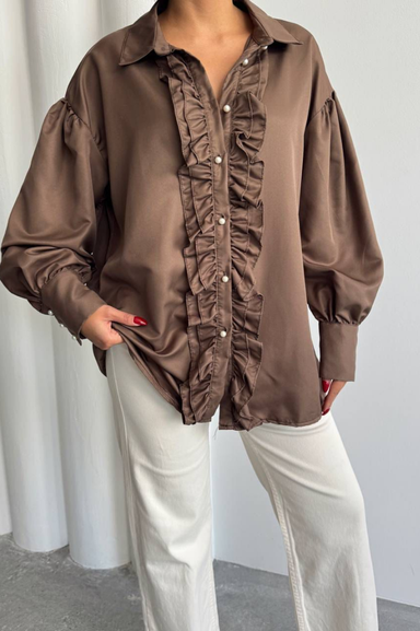 Weak Blue Kadın Kahverengi Tunik Gömlek Fırfırlı Uzun Kollu Tesettür Gömlek Rahat Kalıp Günlük Şık Kombin
