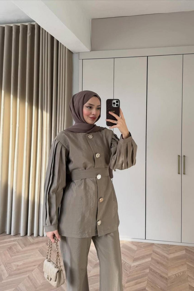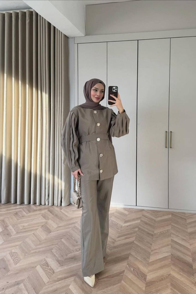 Weak Blue Kadın Haki Takım Tunik Pantolon Set Tesettür İkili Takım Rahat Kalıp Günlük Şık Kombin