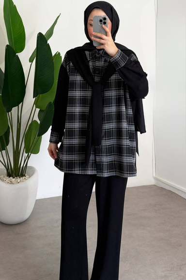 Weak Blue Ekose Kadın Tunik Gömlek Oversize Rahat Kalıp Katmanlı Tesettür Giyim Şık Model
