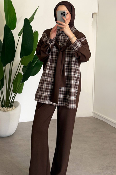 Weak Blue Ekose Kadın Tunik Gömlek Oversize Rahat Kalıp Kahverengi Tesettür Kombin Günlük Şık