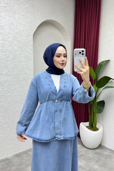 Weak Blue Kadın Denim İkili Takım Açık Mavi Bluz Etek Set Tesettür Jean Takım Rahat Kalıp Günlük Şık
