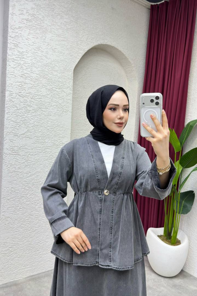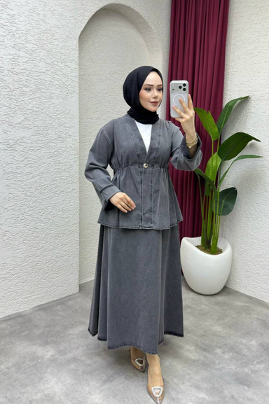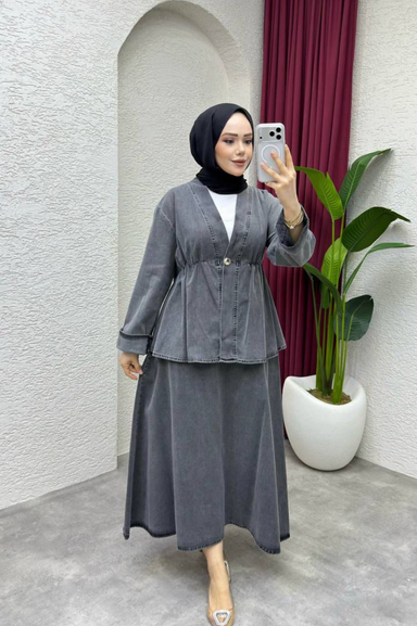 Weak Blue Kadın Gri Denim Takım Bluz Etek Set Tesettür İkili Takım Rahat Kalıp Günlük Şık Kombin