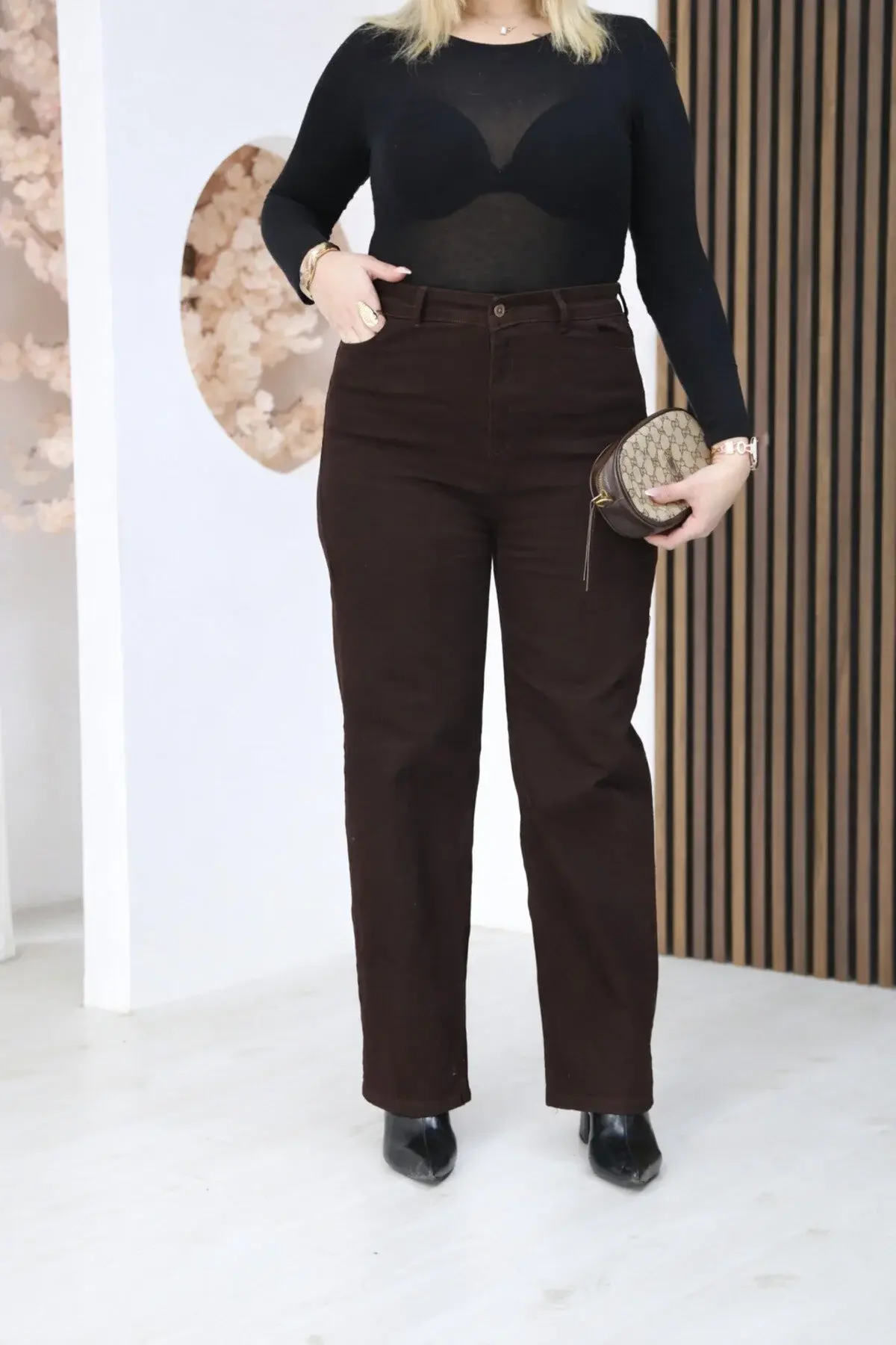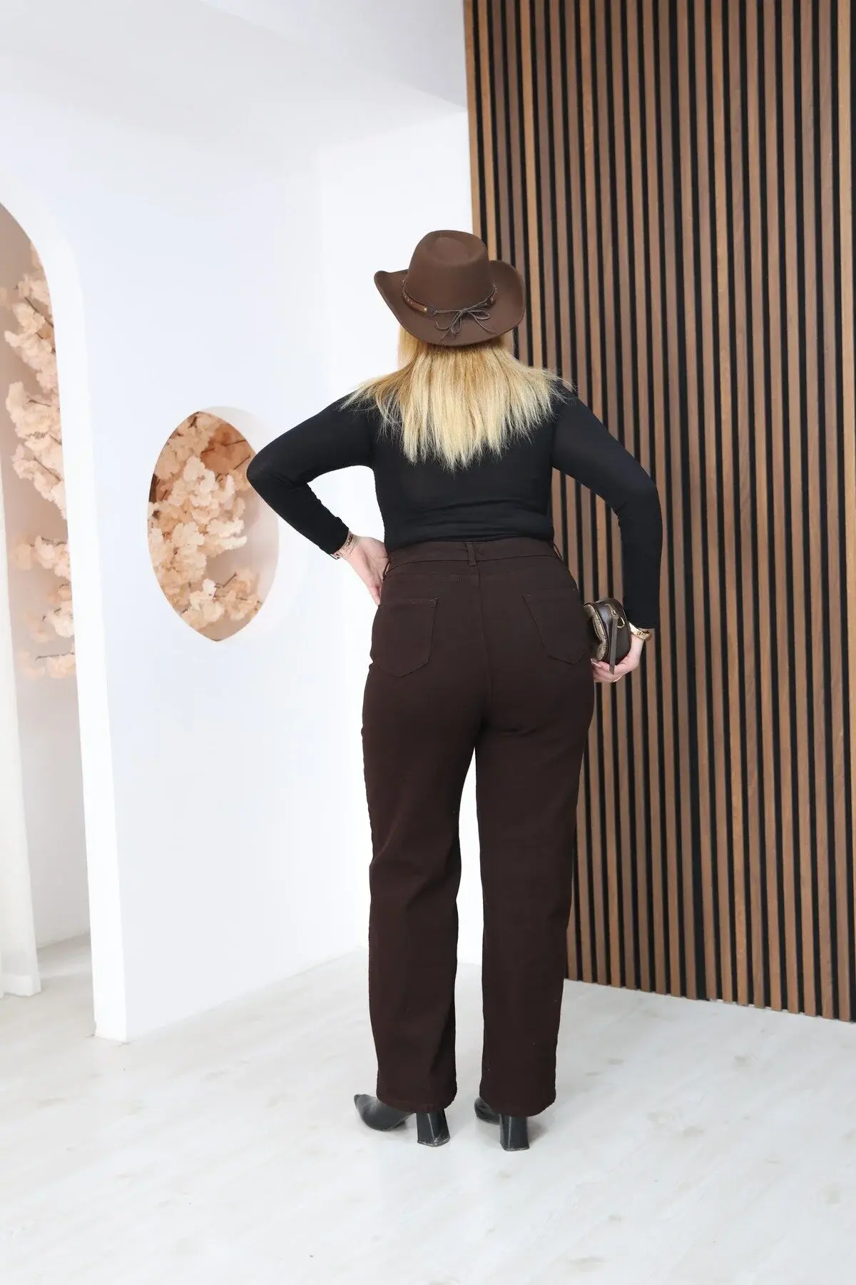 Büyük Beden Kadın Kahverengi Yüksek Bel Bol Paça Jean Pantolon Geniş Kesim Kot