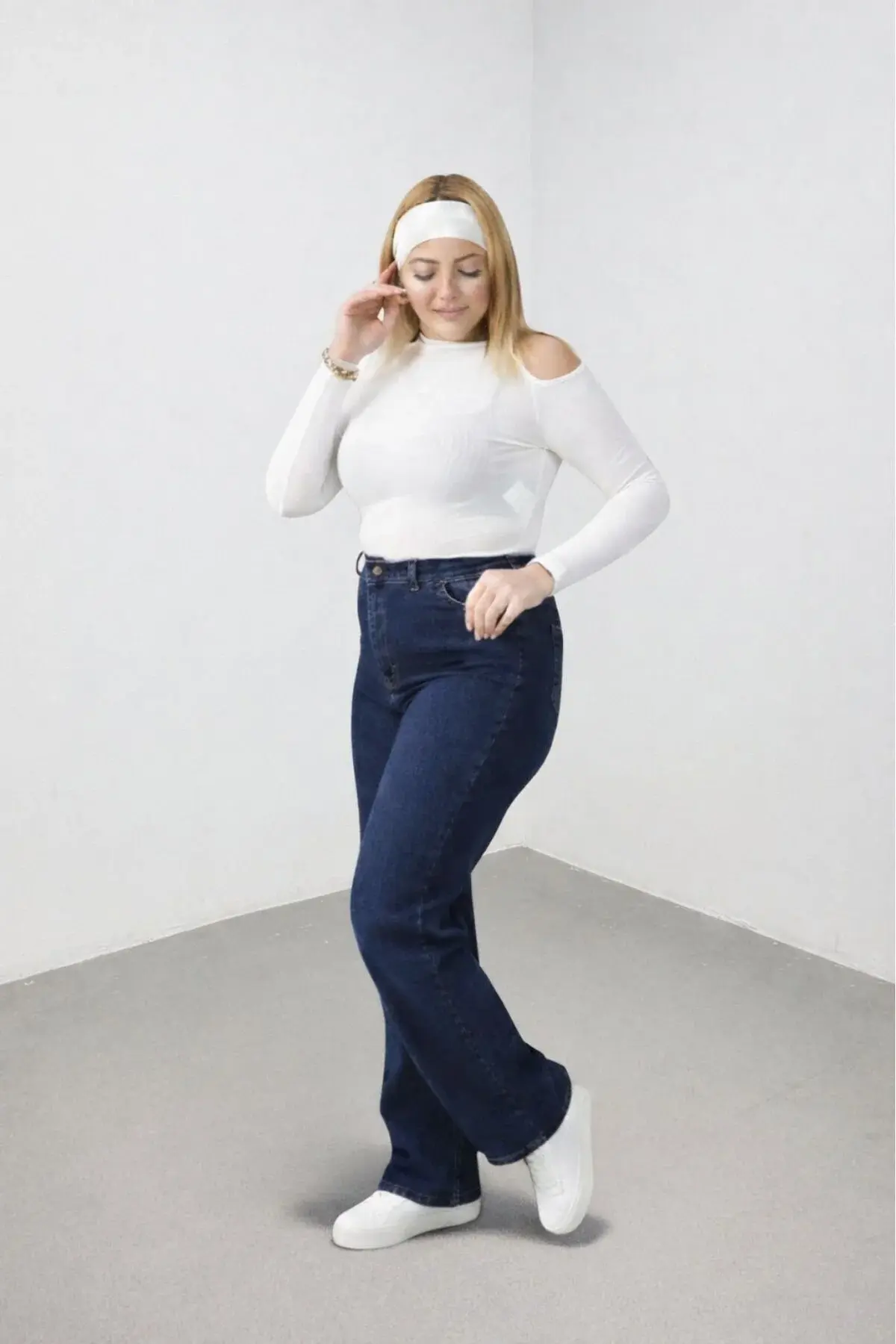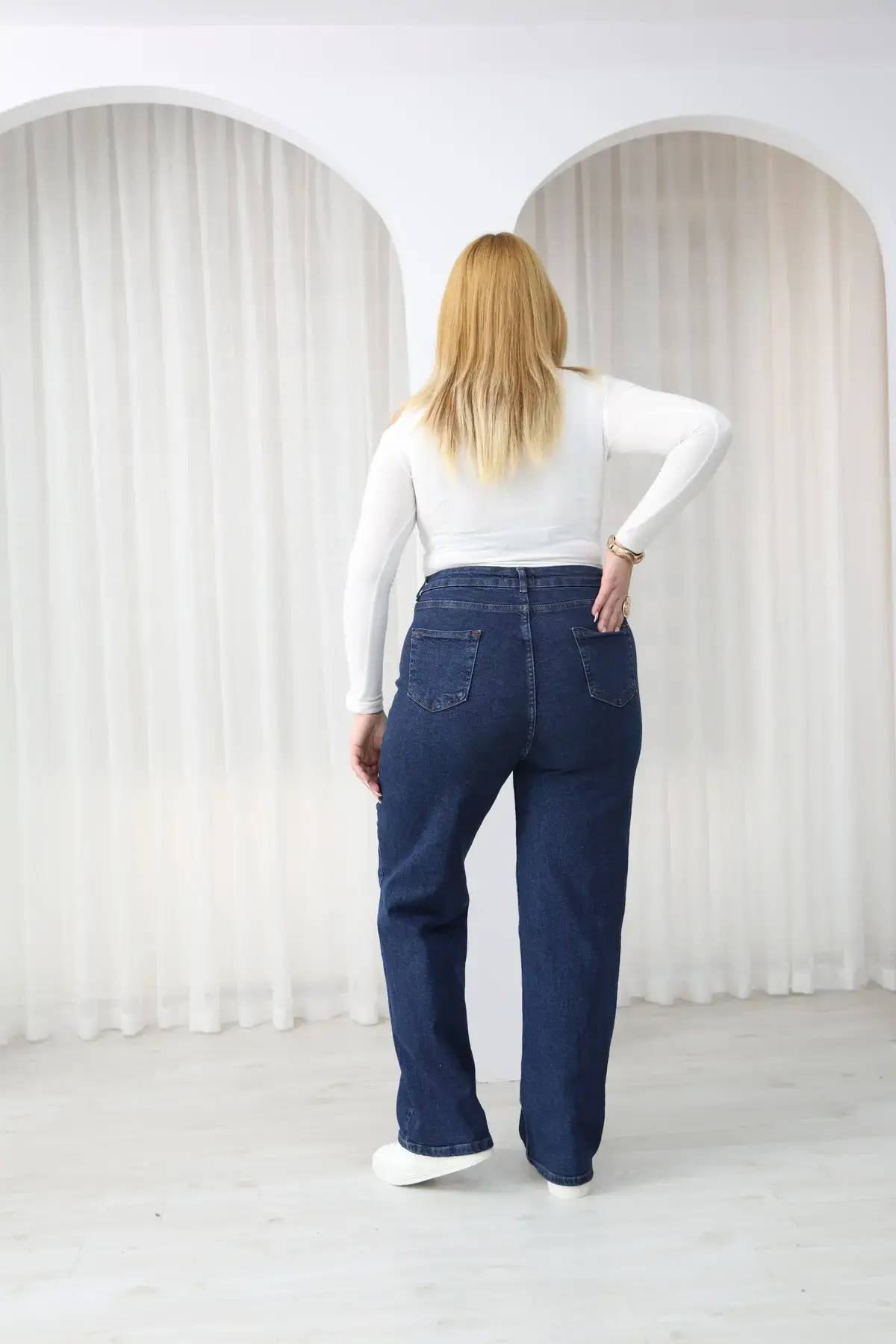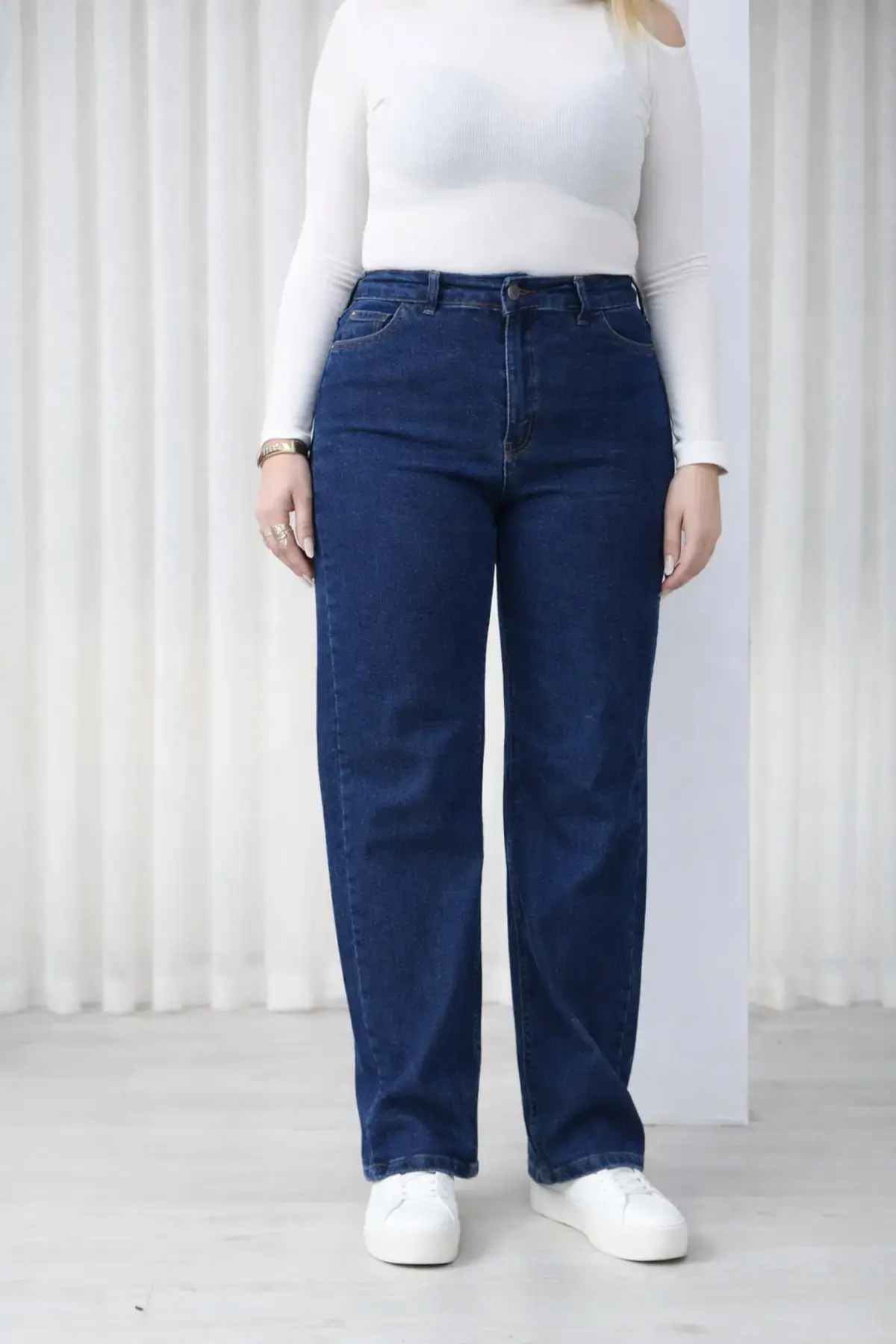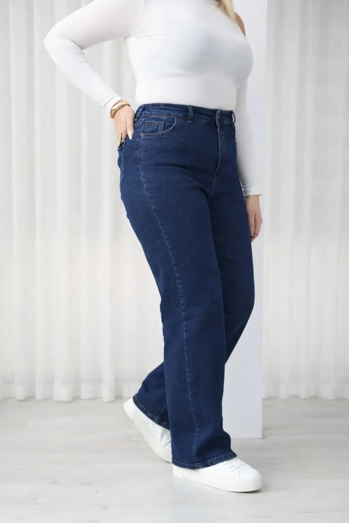 Büyük Beden Kadın Koyu Mavi Yüksek Bel Bol Paça Jean Pantolon Rahat Kesim Kot