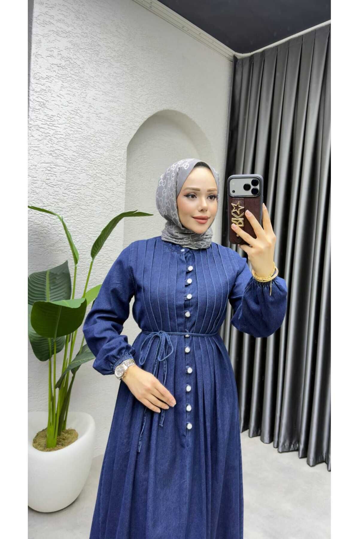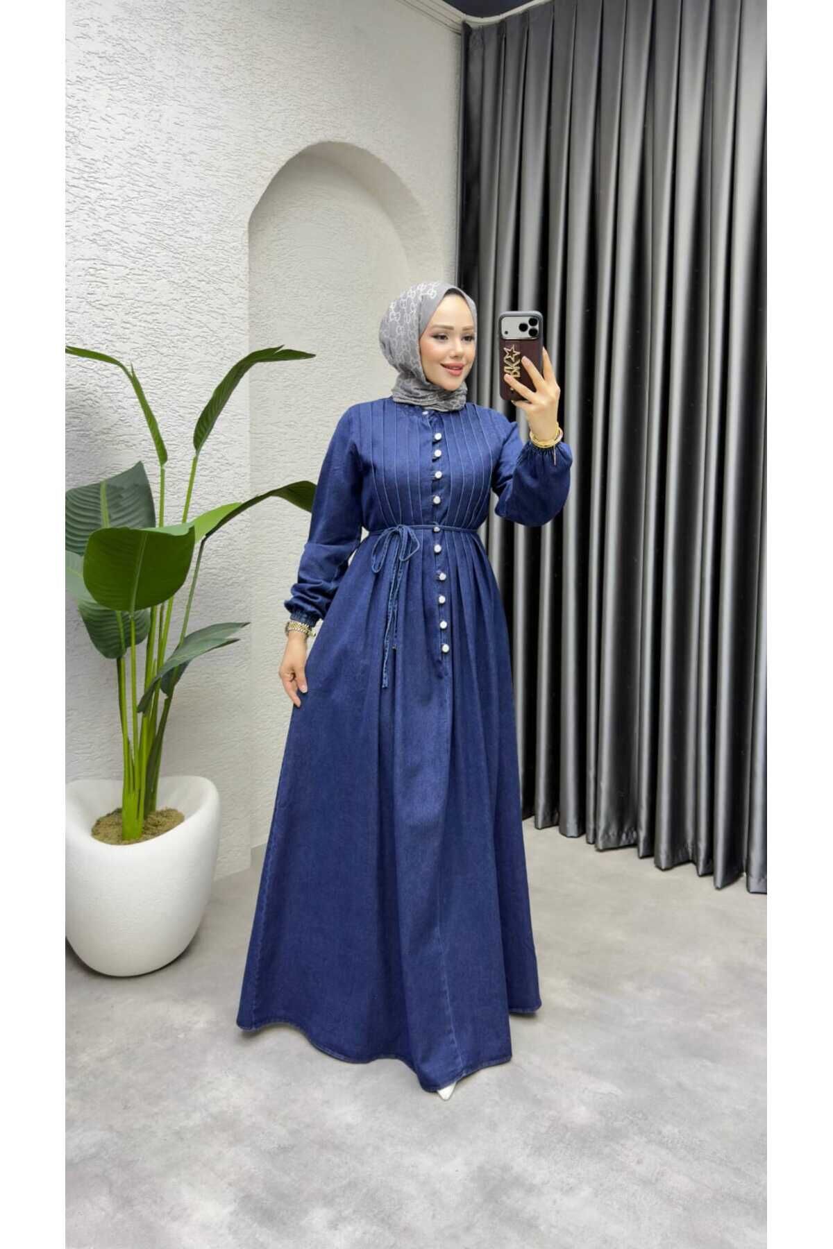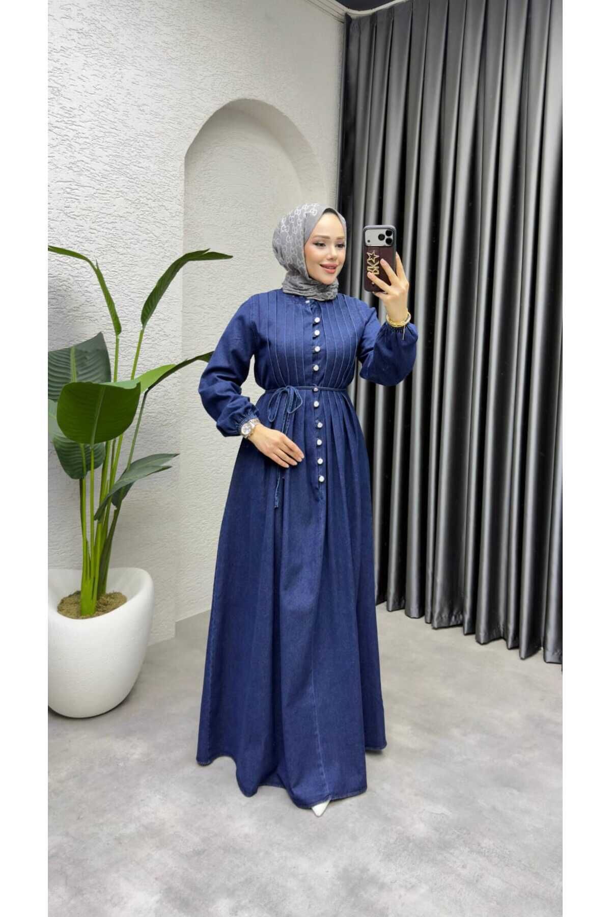 Kadın Lacivert Düğmeli Belden Bağlamalı Kot Tesettür Elbise