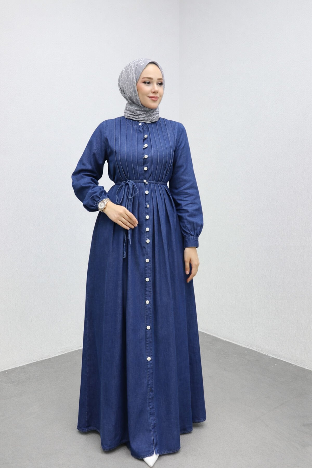 Önü düğmeli, belden bağlamalı tesettür elbise ; Uzun kollu ve uzun boy tasarımıyla tesettüre uygundur ; Belden bağlamalı yapısı sayesinde vücuda göre ayarlanabilir ; A kesim eteği ile rahat ve dökümlü bir duruş sunar ; Günlük kullanım, ofis ve özel günler için uygundur ; Astarsızdır, iç göstermez ; Mevsimlik kullanıma uygundur ; Kumaş: Kot / Denim görünümlü dokuma kumaş ; Modelin üzerindeki beden: 38 ; Model ölçüleri: Göğüs: 88 cm ; Bel: 68 cm ; Basen: 97 cm ; Boy: 165 cm ; Kilo: 58 kg ; Ürün belden bağlamalı olduğu için bel ölçüsü ayarlanabilmektedir.; ; Göğüs ve bel bölgesi dar sevmeyen müşteriler için 1 beden büyük tercih edilmesi önerilir.;