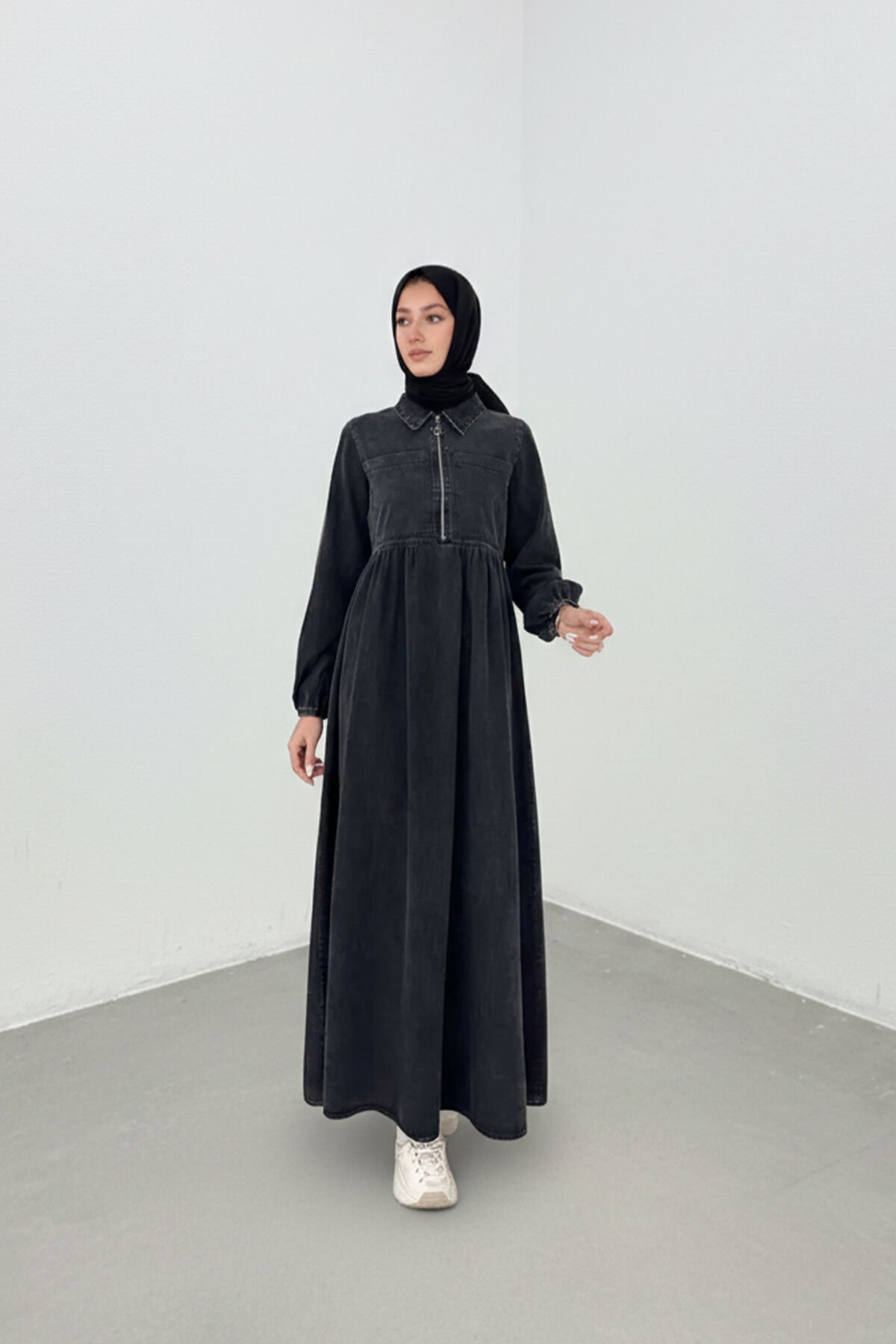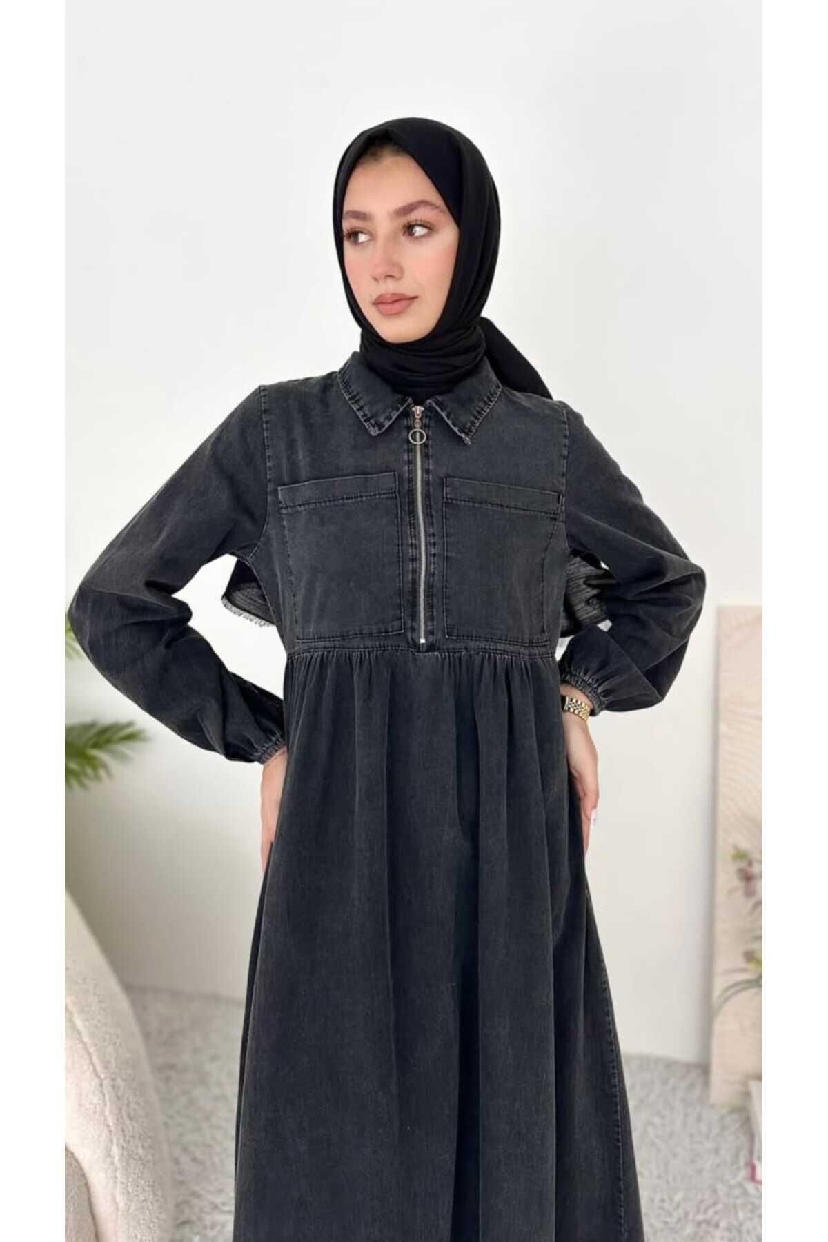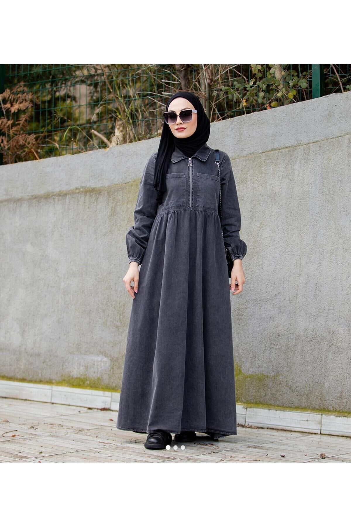 Kadın Tesettür Fermuarlı Cepli İnce Kot Elbise