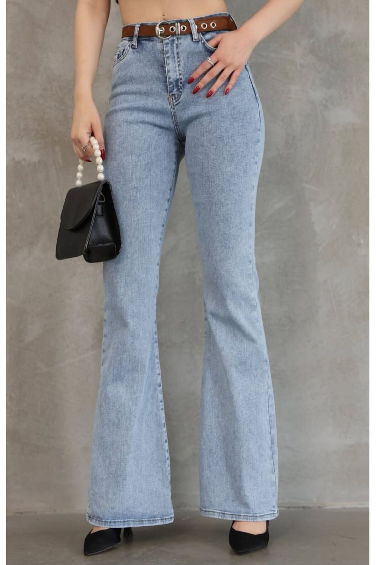 Kadın Yüksek Bel İspanyol Paça Açık Mavi Denim Likralı Jean Pantolon
