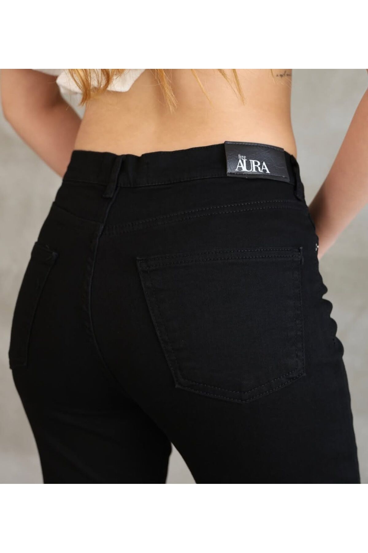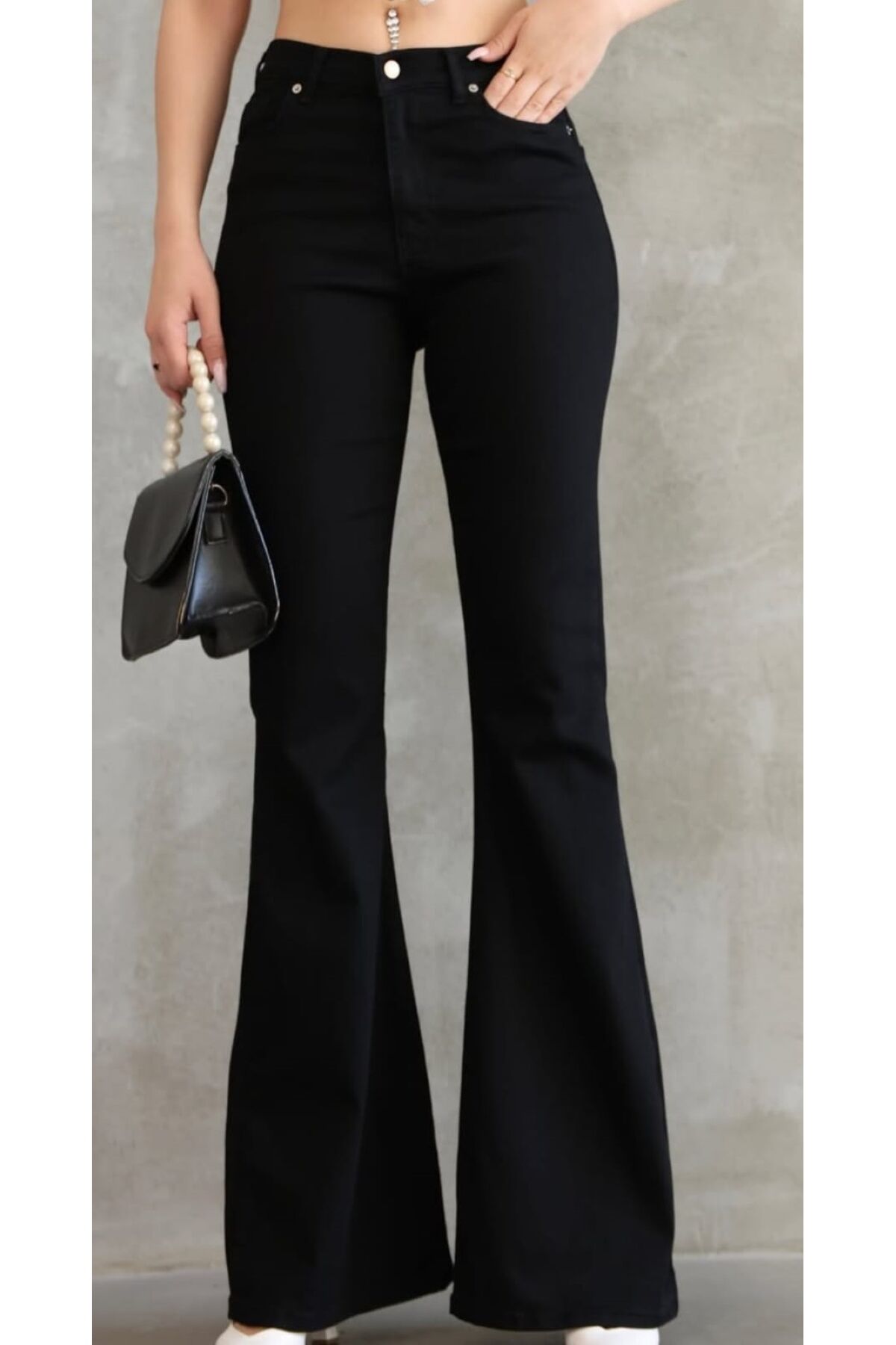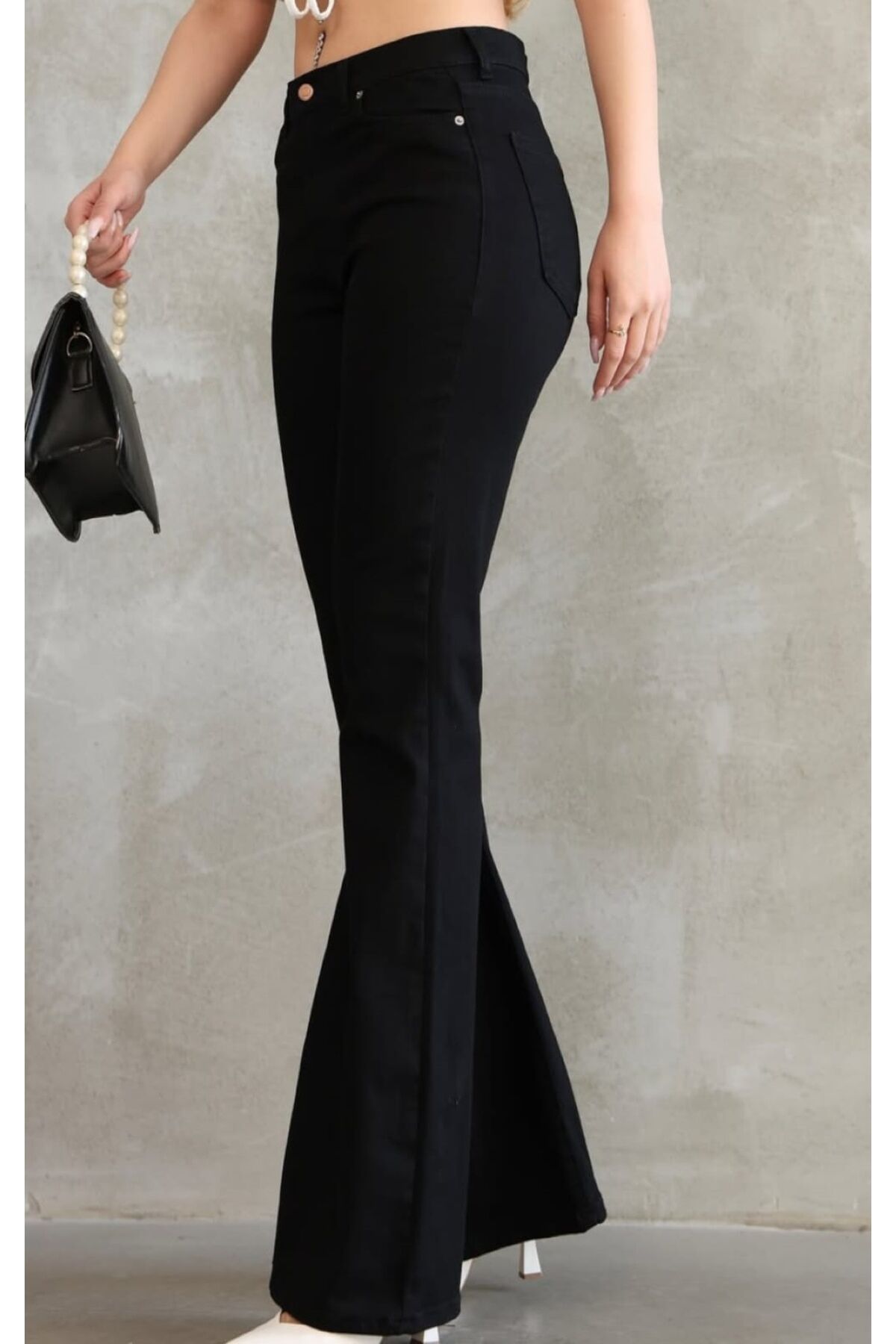 Kadın Yüksek Bel İspanyol Paça Siyah Denim Likralı Jean Pantolon