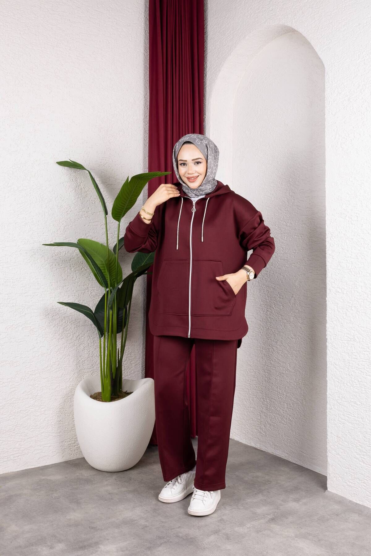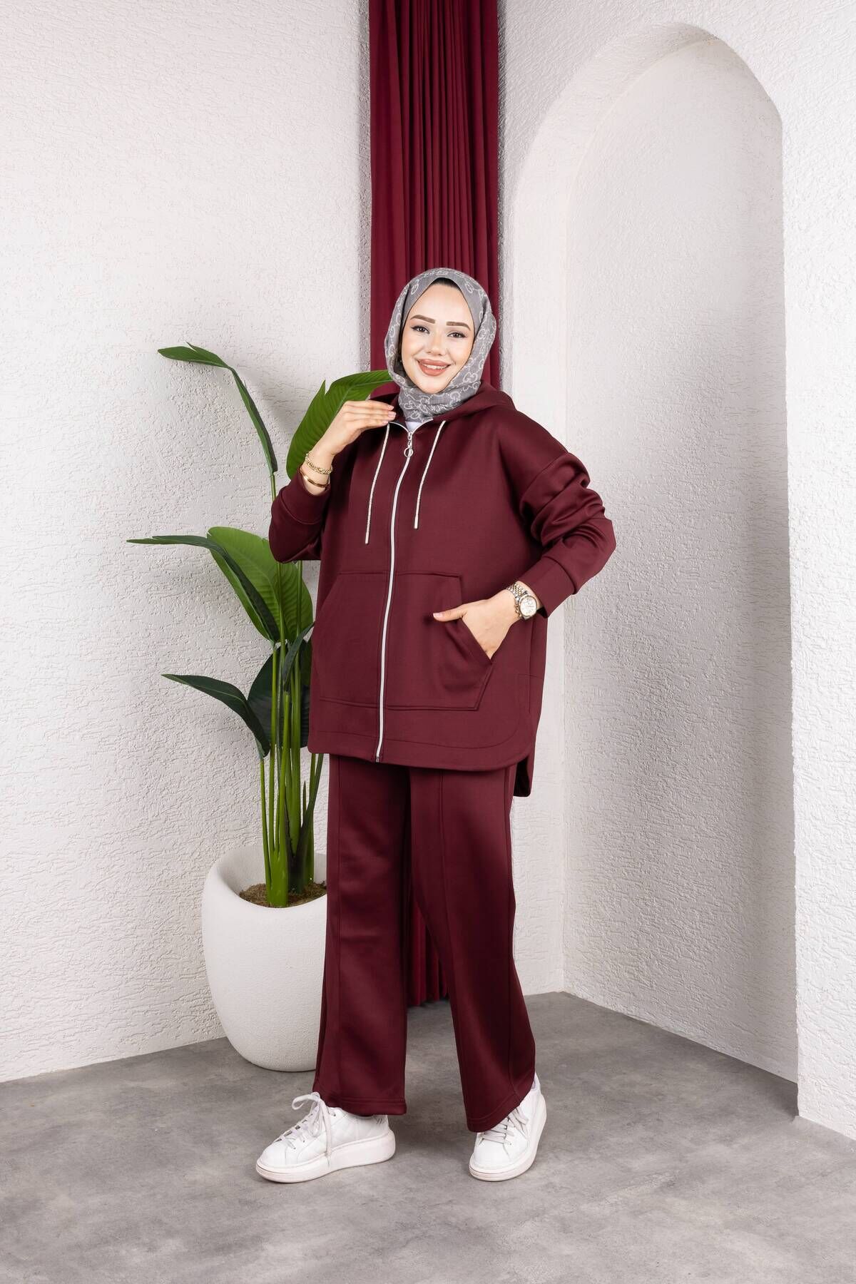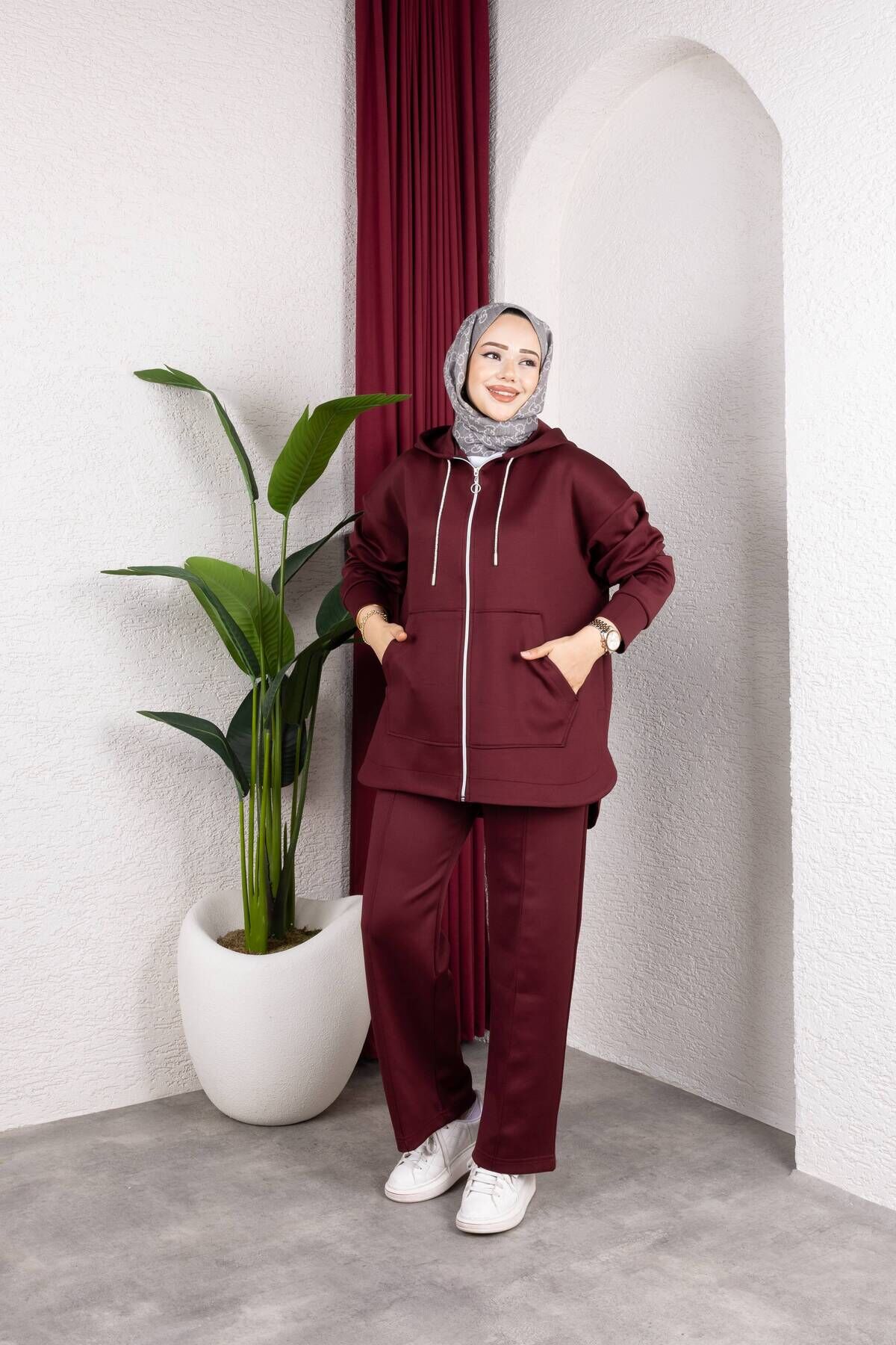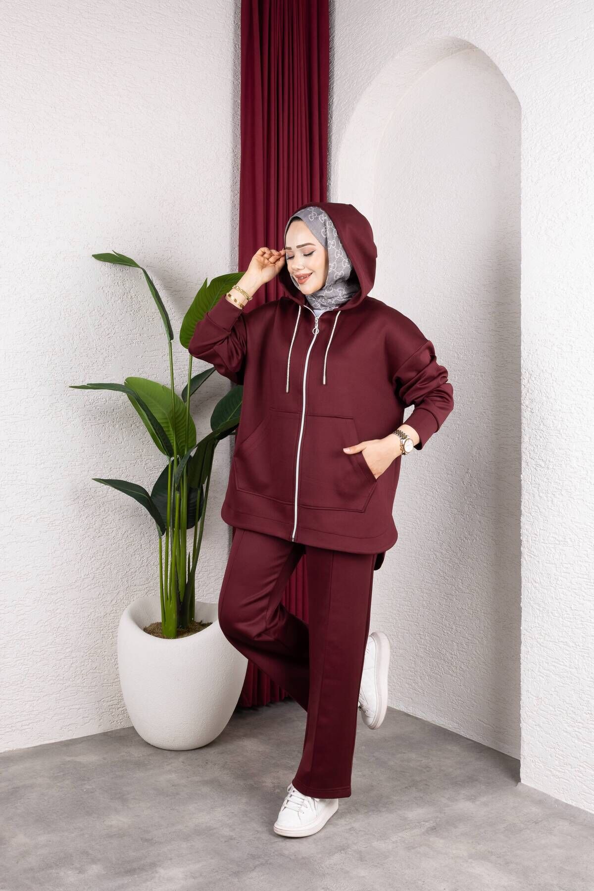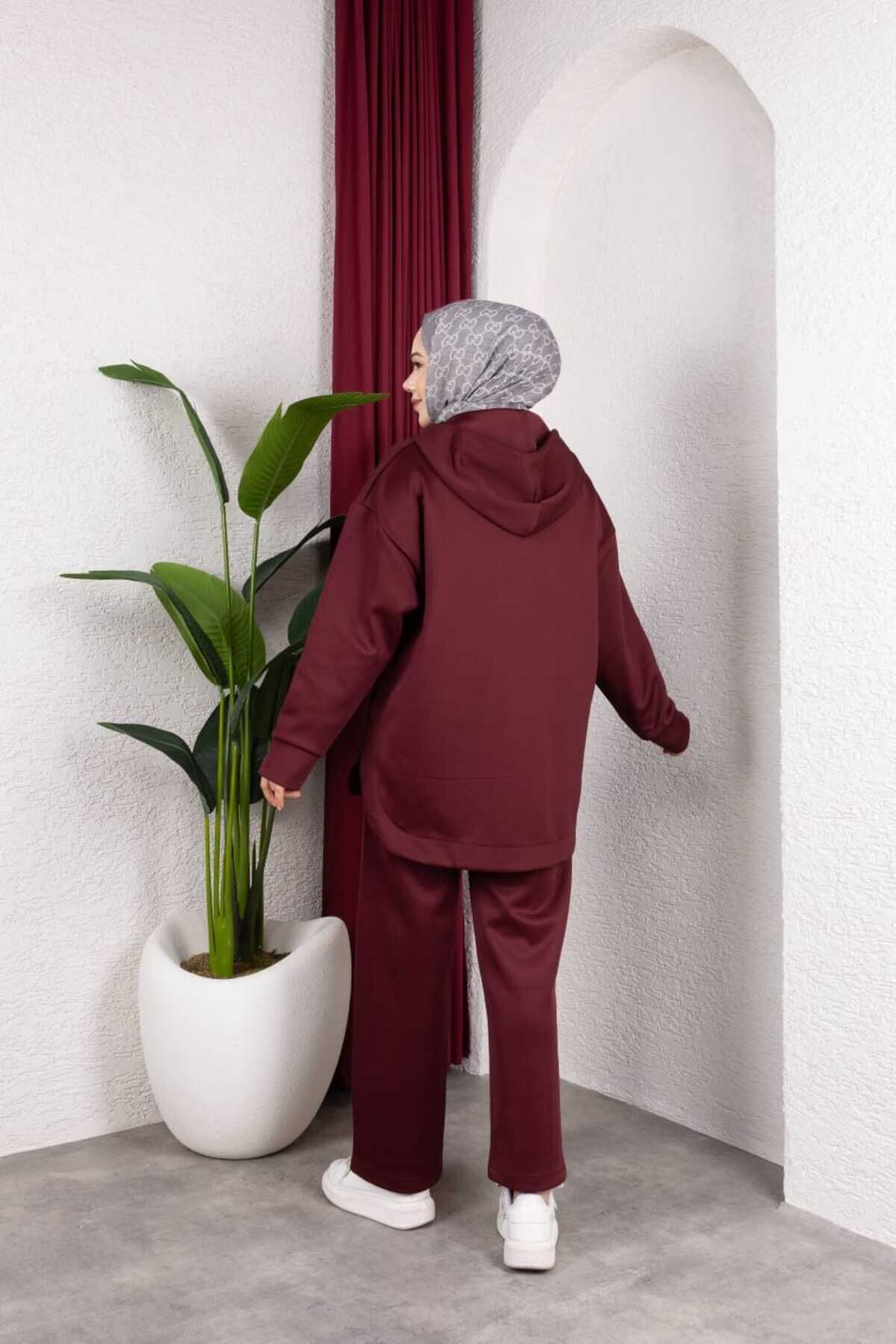 Oversize Kapüşonlu Eşofman Takımı Tesettür Spor Takım – Bordo Renk