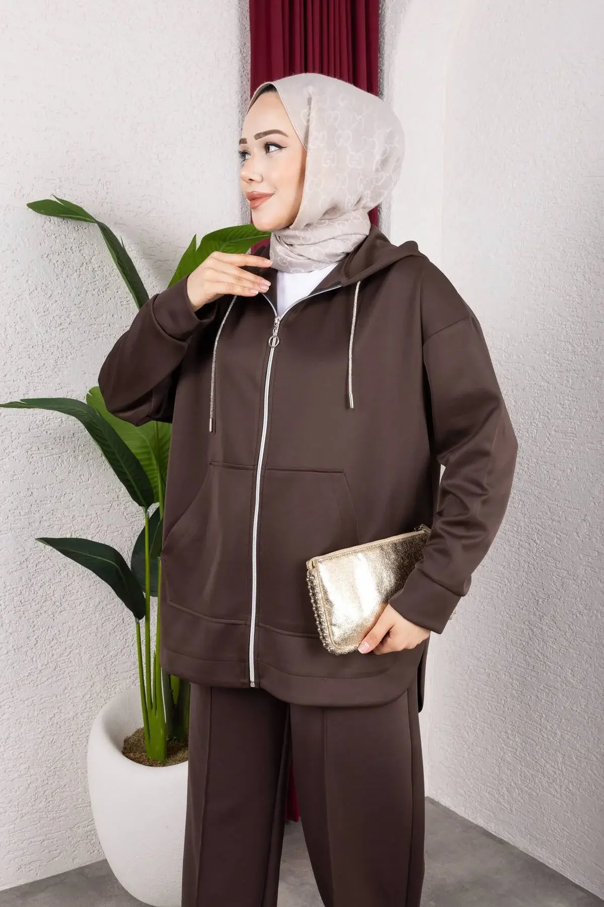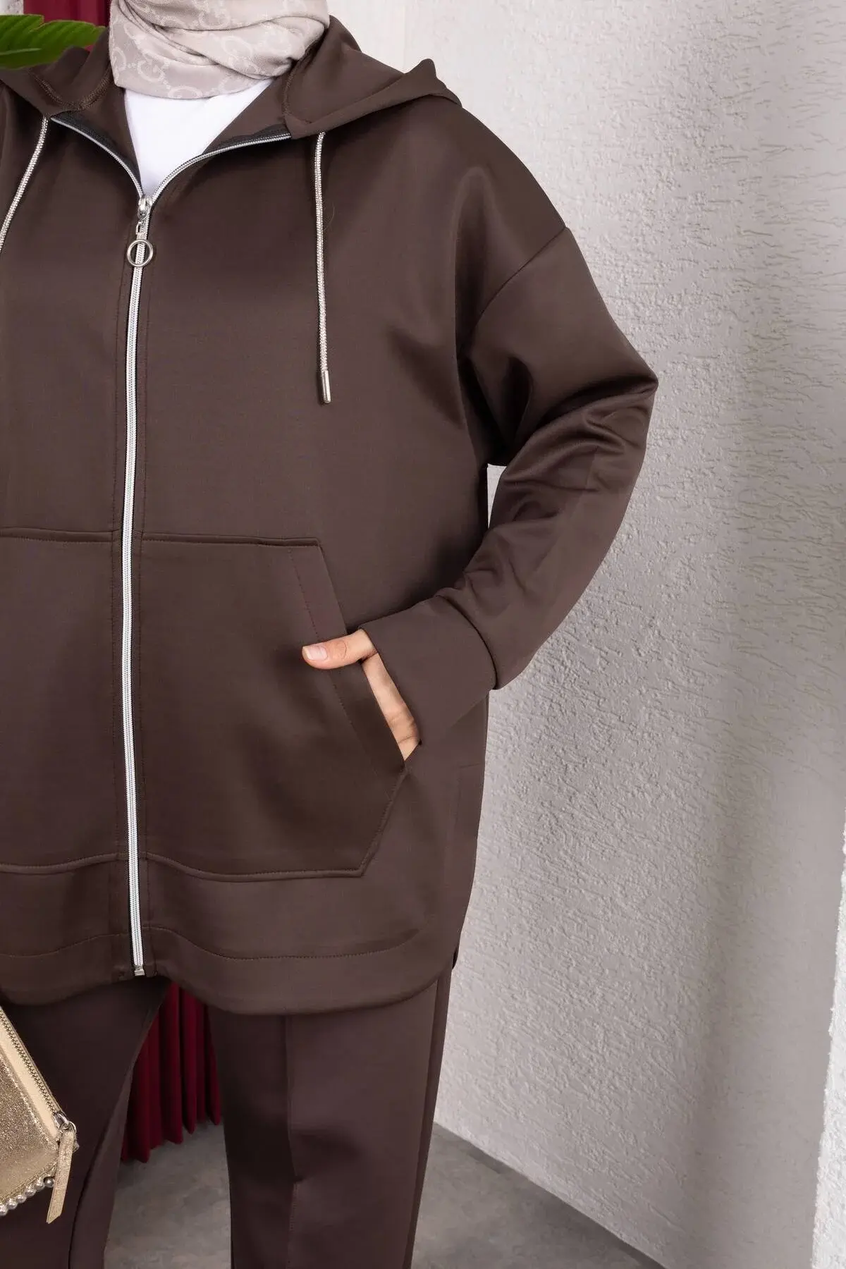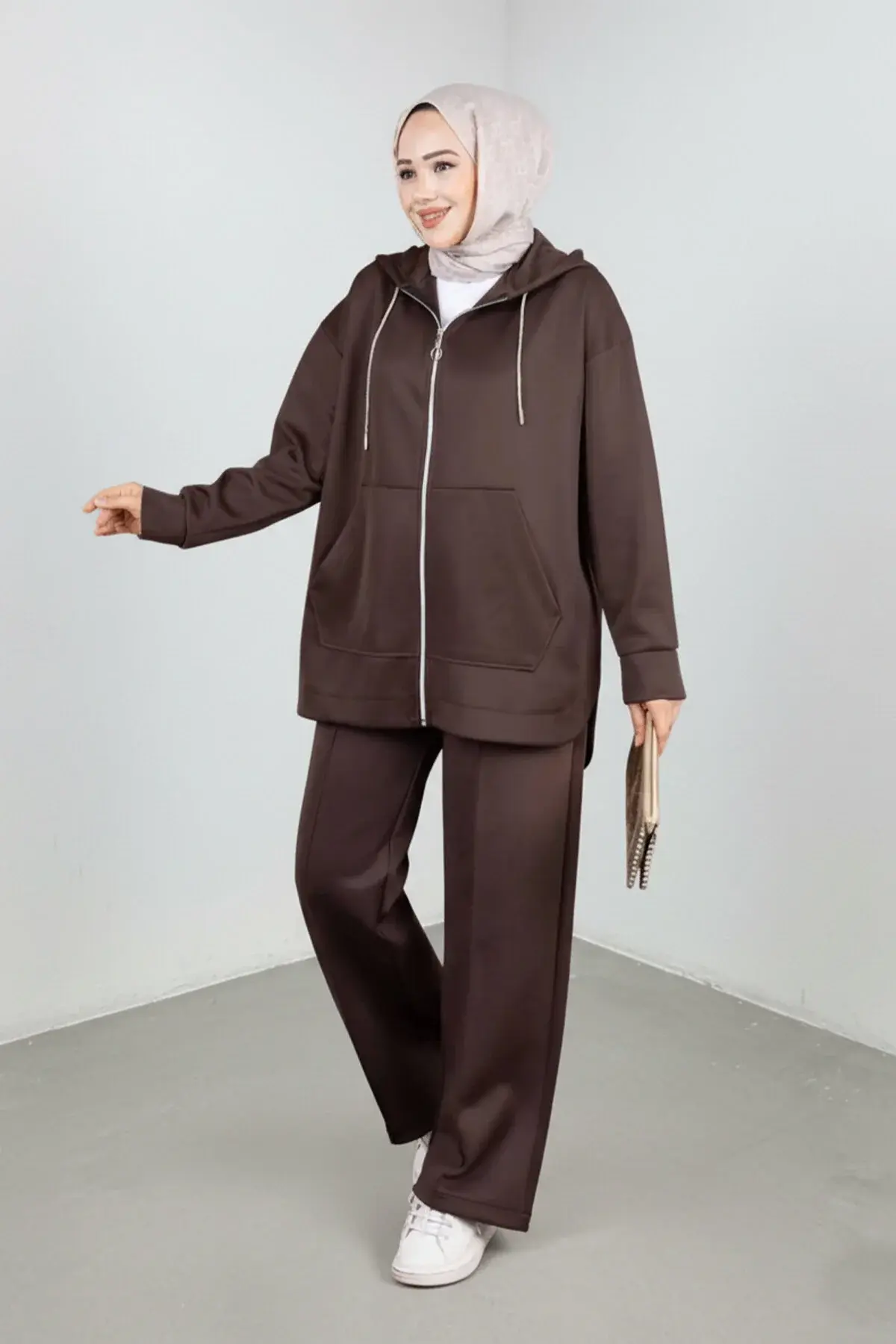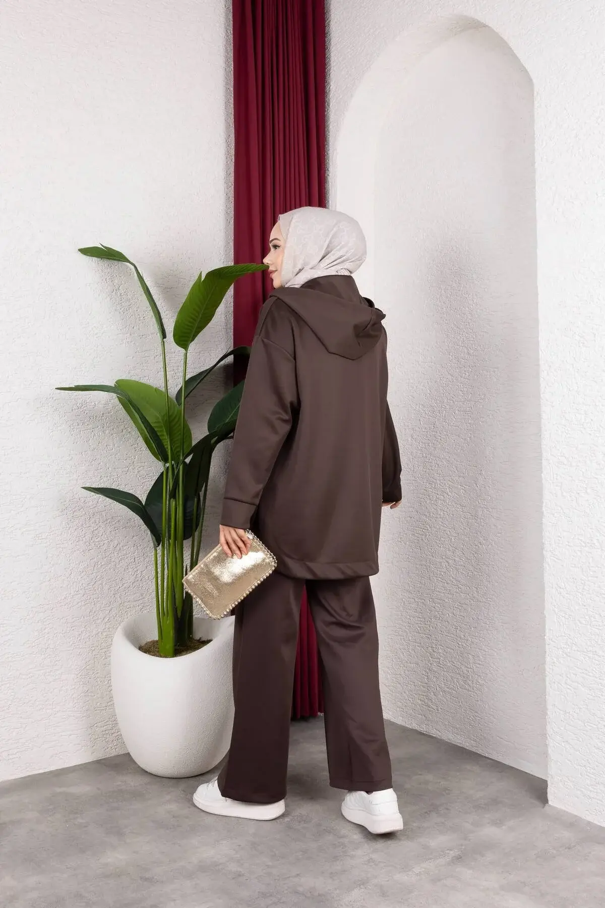 Oversize Kapüşonlu Eşofman Takımı Tesettür Spor Takım - Kahverengi Renk