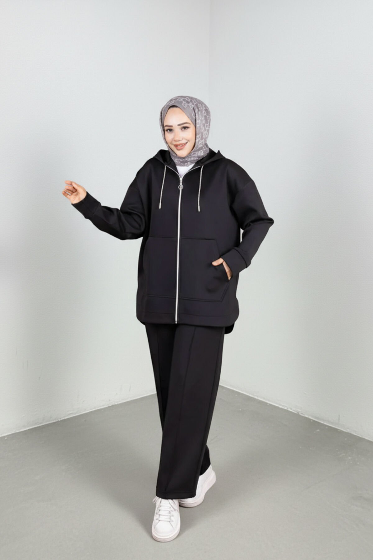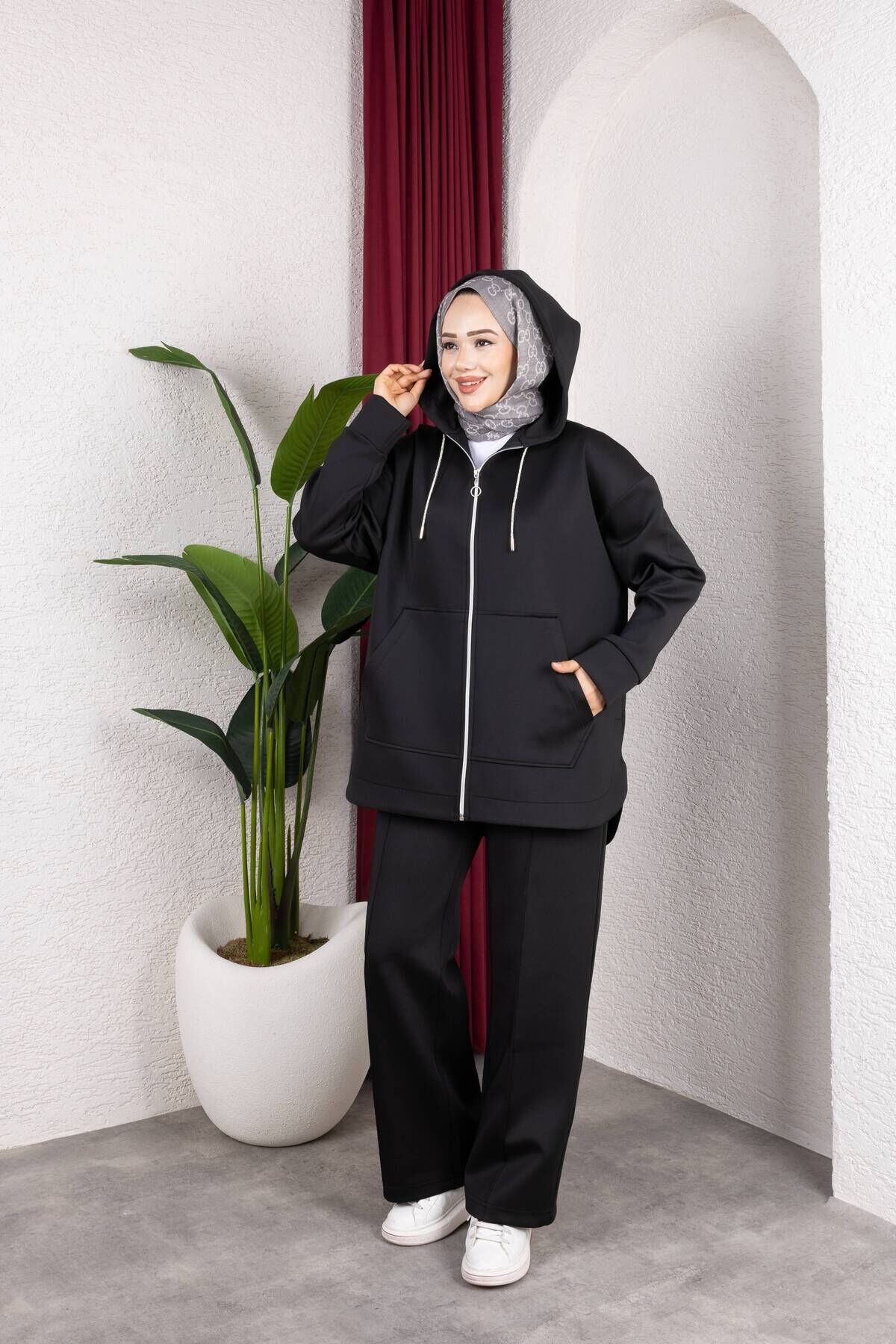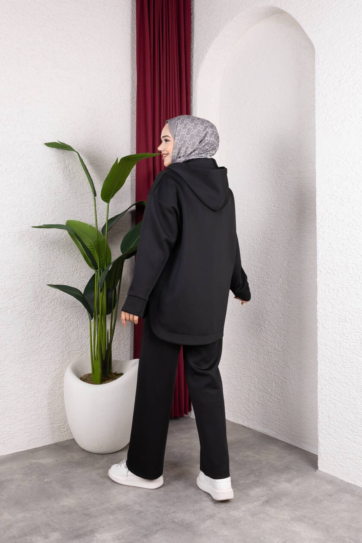 Oversize Kapüşonlu Eşofman Takımı Tesettür Spor Takım - Siyah Renk
