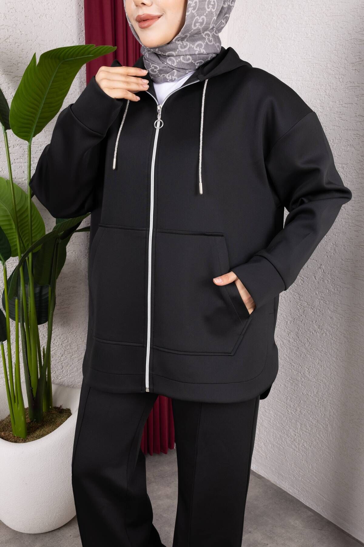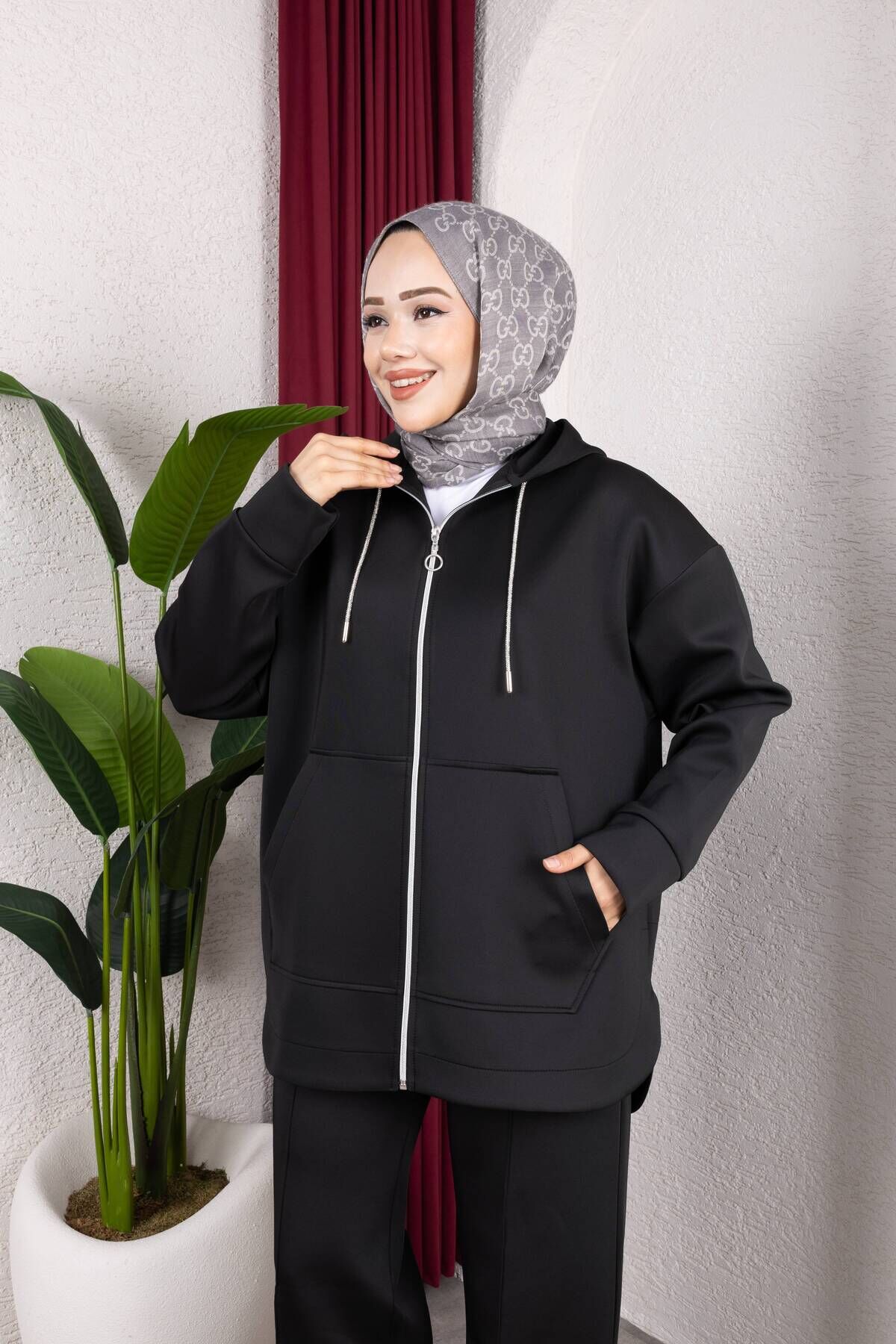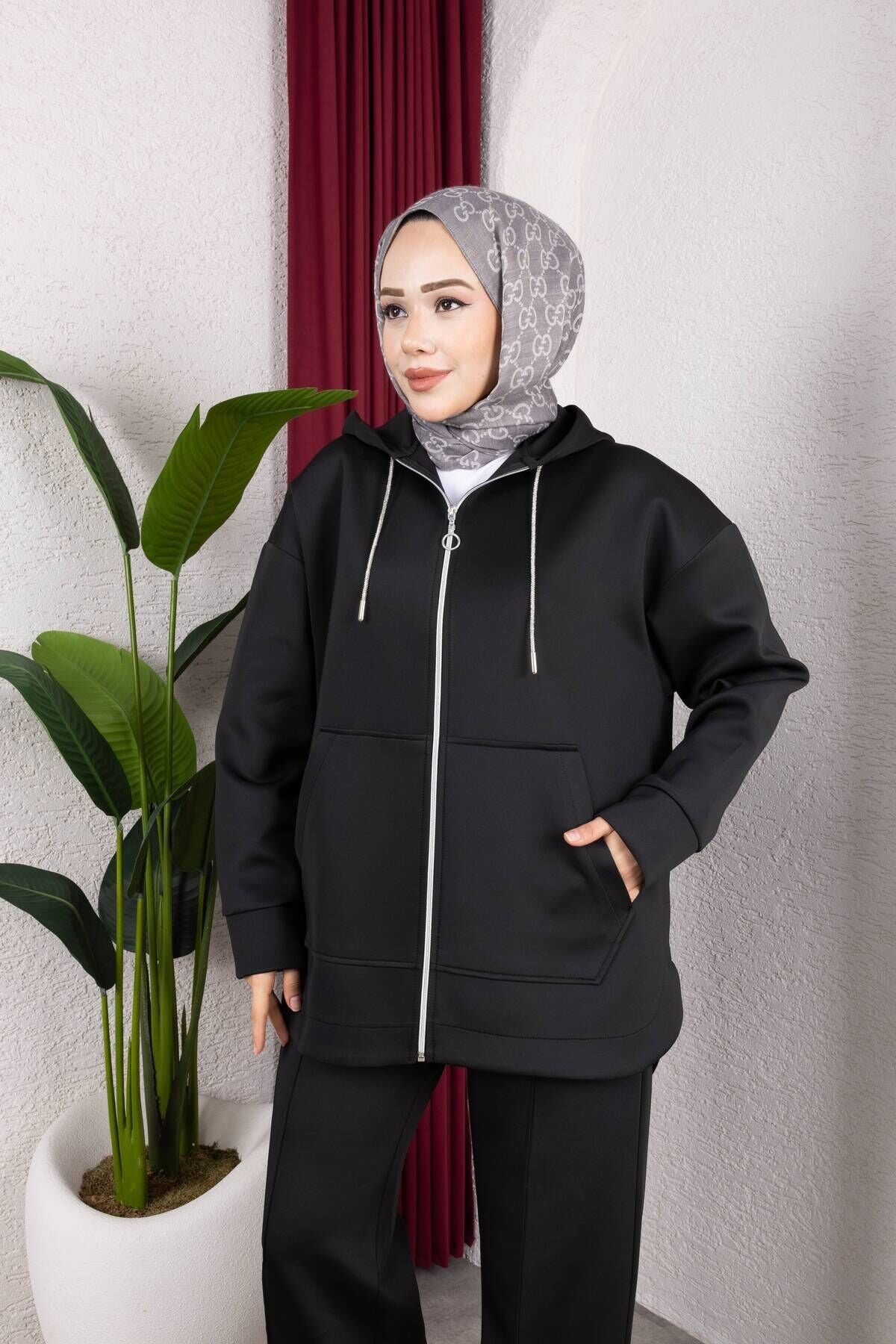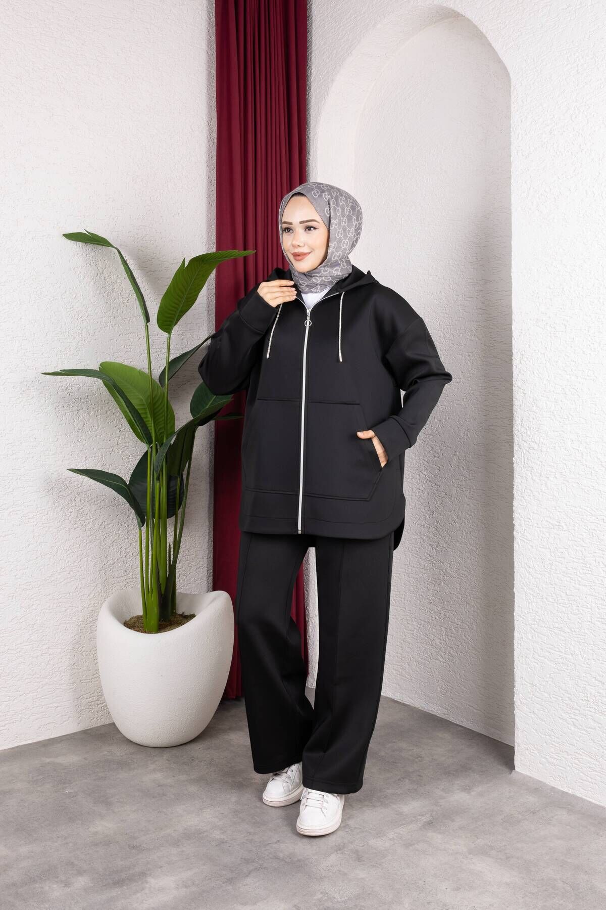 Oversize Kapüşonlu Eşofman Takımı Tesettür Spor Takım - Siyah Renk